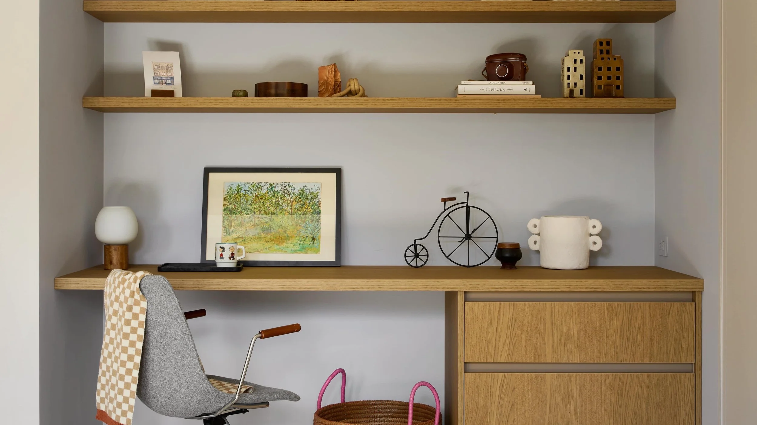 Curved architectural details soften the spaces throughout, allowing moments of whimsy to emerge without feeling overt or thematic. Storage and work surfaces are thoughtfully integrated, supporting both daily routines and creative play while maintaining a calm, uncluttered atmosphere.